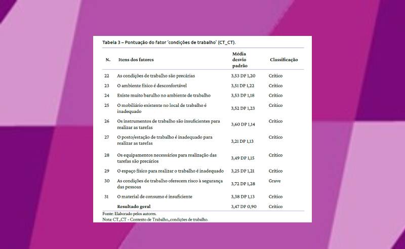 O presente estudo objetivou avaliar o contexto de trabalho dos profissionais do Serviço de Atendimento Móvel de Urgência em Fortaleza, Ceará. Foi realizada uma pesquisa transversal e descritiva, que contou com a participação de uma amostra não probabilística de 229 participantes de diferentes categorias profissionais que atuam no serviço. Os participantes responderam à Escala de Avaliação do Contexto de Trabalho, composta por três fatores. Os dados foram analisados por meio de estatística descritiva e multivariada. Os resultados evidenciaram que os fatores analisados na escala – organização do trabalho, relações socioprofissionais e condições de trabalho – apresentaram índices críticos, que sinalizam um alerta para o risco de adoecimento. Conclui-se que os profissionais do Serviço de Atendimento Móvel de Urgência vivenciam um risco potencial que poderá desencadear danos à saúde ocupacional. Recomenda-se que sejam efetivadas medidas para melhoria na organização do trabalho, em suas condições laborais e suas relações socioprofissionais.