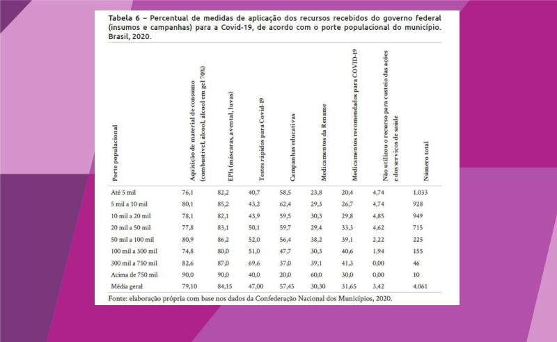 Neste artigo, objetivou-se analisar a forma como os governos municipais responderam à crise sanitária e quais medidas desenvolveram em termos de diagnóstico da Covid-19 e alocação dos recursos provenientes de fontes federais. Para tanto, informações oriundas de uma pesquisa com 4.061 prefeitos coordenada pela Confederação Nacional dos Municípios foram sistematizadas e comparadas com outras bases de dados oficiais. Conclui-se que, a despeito da falta de instrumentos de coordenação desenvolvidos em âmbito federal, a destinação dos recursos e o desenvolvimento de políticas por parte dos municípios se orientaram pela concentração de serviços de referência regional em municípios de grande e médio portes.